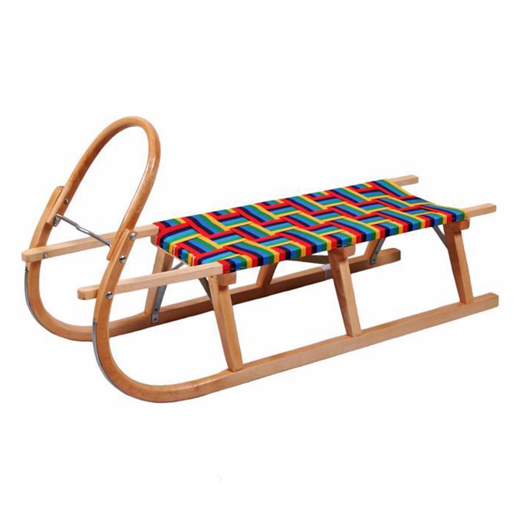 Bytelnější, trvanlivější jsou sáně dřevěné. Máte na nich i možnost připevnit dětskou ohrádku. Tyto klasické sáňky jsou vyrobeny z kvalitního bukového dřeva. Poskytují dostatečný prostor pro jedno dítě a dospělého nebo dva dospělé. Sedadlo je vyplétané textilními nepromokavými popruhy, které mohou být různého barevného provedení. Spodní část je opatřena ocelovou skluznicí. Rozměry saní jsou 113 cm na délku a 30 cm na šířku, sedadlo je dlouhé 70 cm. Nosnost saní je 80 kg.